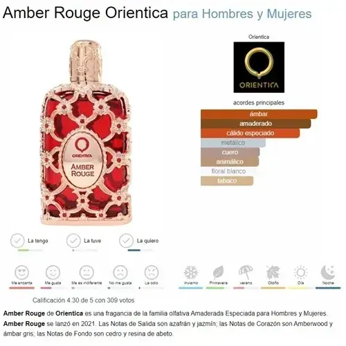Amber Rouge de Orientica Premium es una fragancia de la familia olfativa Amaderada Especiada para Hombres y Mujeres. Amber Rouge se lanzó en 2021. Las Notas de Salida son azafrán y jazmín; las ...
