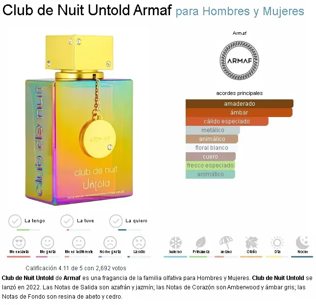 Club de Nuit Untold de Armaf es una fragancia de la familia olfativa para Hombres y Mujeres. Club de Nuit Untold se lanzó en 2022. Las Notas de Salida son azafrán y jazmín; las Notas de Corazón son Amberwood y ámbar gris; las Notas de Fondo son resina de abeto...