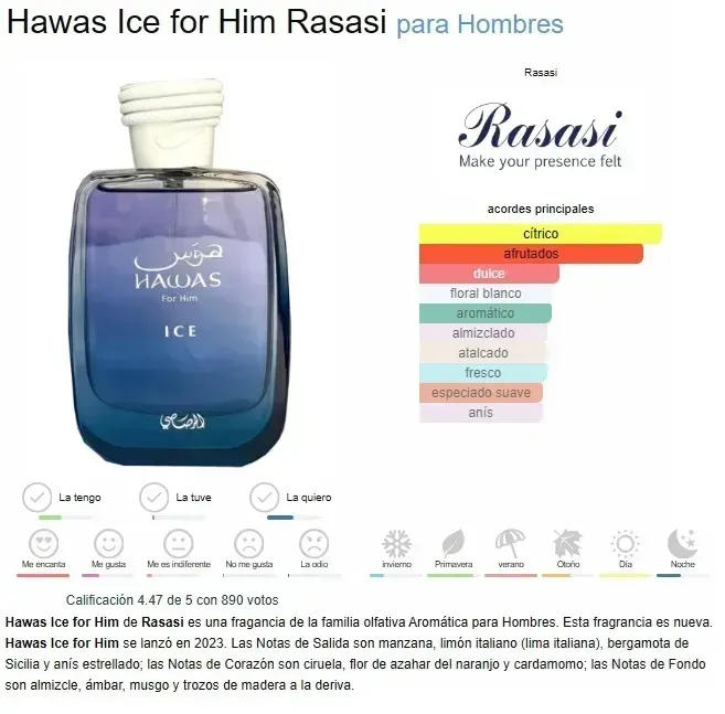 Hawas Ice de Rasasi es una fragancia de la familia olfativa Aromática para Hombres. Hawas Ice se lanzó en 2023. Las Notas de Salida son manzana, limón italiano (lima italiana), bergamota de Si...