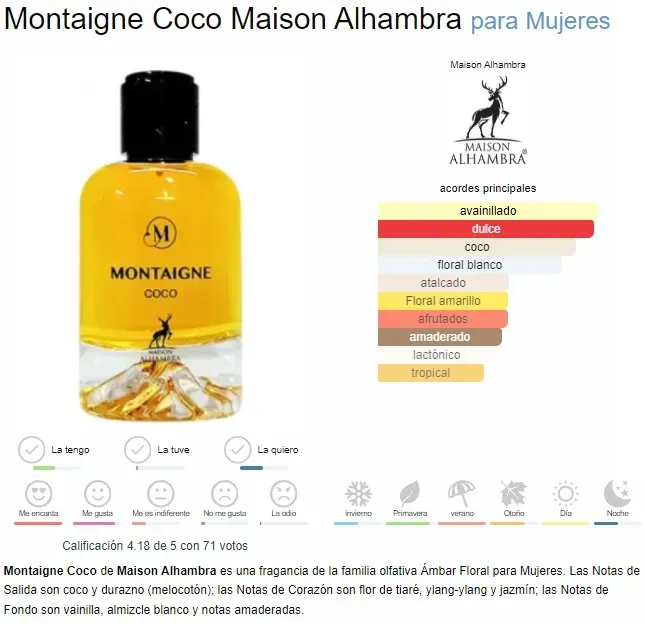 Montaigne Coco de Maison Alhambra es una fragancia de la familia olfativa Oriental Floral para Mujeres. Las Notas de Salida son coco y durazno (melocotón); las Notas de Corazón son flor de tiaré...