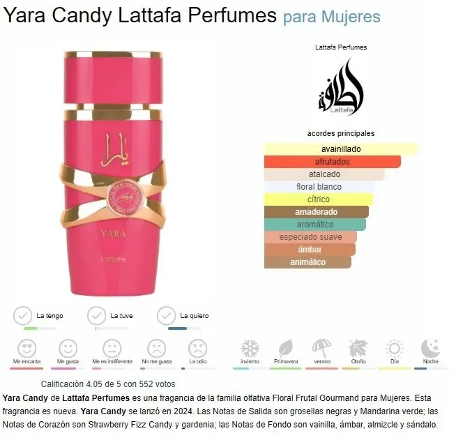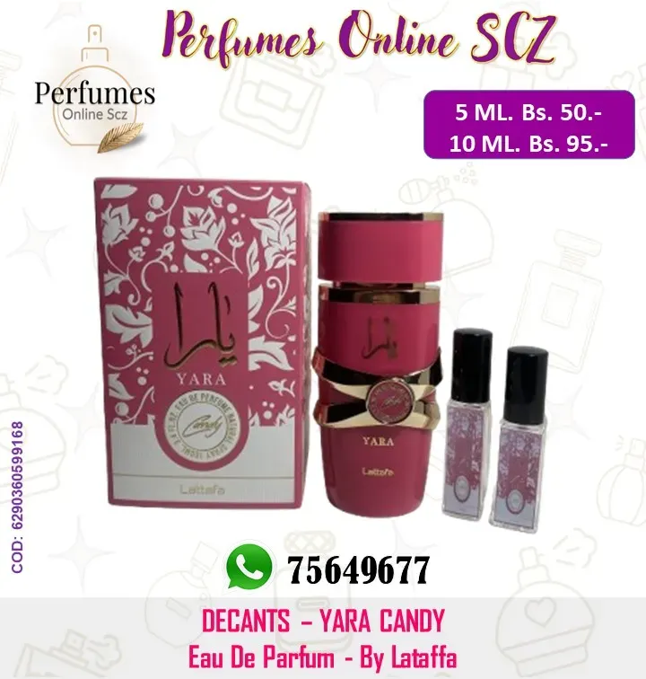 Yara Candy de Lattafa Perfumes es una fragancia de la familia olfativa Floral Frutal Gourmand para Mujeres. Esta fragrancia es nueva. Yara Candy se lanzó en 2024. Las Notas de Salida son grosellas negras y Mandarina verde; las Notas de Corazón son Strawberry F...