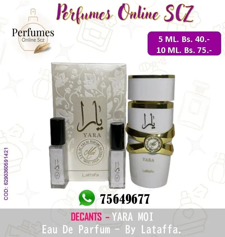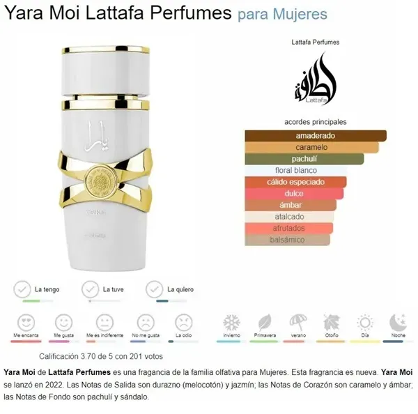 Yara Moi de Lattafa Perfumes es una fragancia de la familia olfativa para Mujeres. Yara Moi se lanzó en 2022. Las Notas de Salida son jazmín y durazno (melocotón); las Notas de Corazón son car...